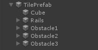- Skapa 3 GameObjects inuti "TilePrefab"-objektet och döp dem till "Obstacle1", "Obstacle2" och "Obstacle3"