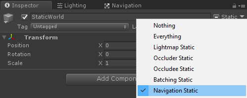 Glöm inte heller att markera varje statiskt objekt i scenen som navigeringsstatiskt innan du bakar NavMesh: