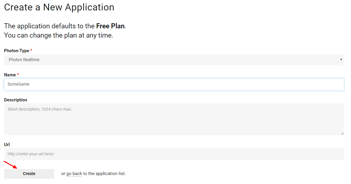 - På sidan för att skapa, för Photon Type välj "Photon Realtime" och för Namn, skriv valfritt namn och klicka sedan "Create"