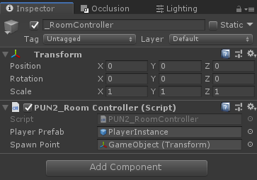 - Bifoga PUN2_RoomController-skriptet till _RoomController-objektet