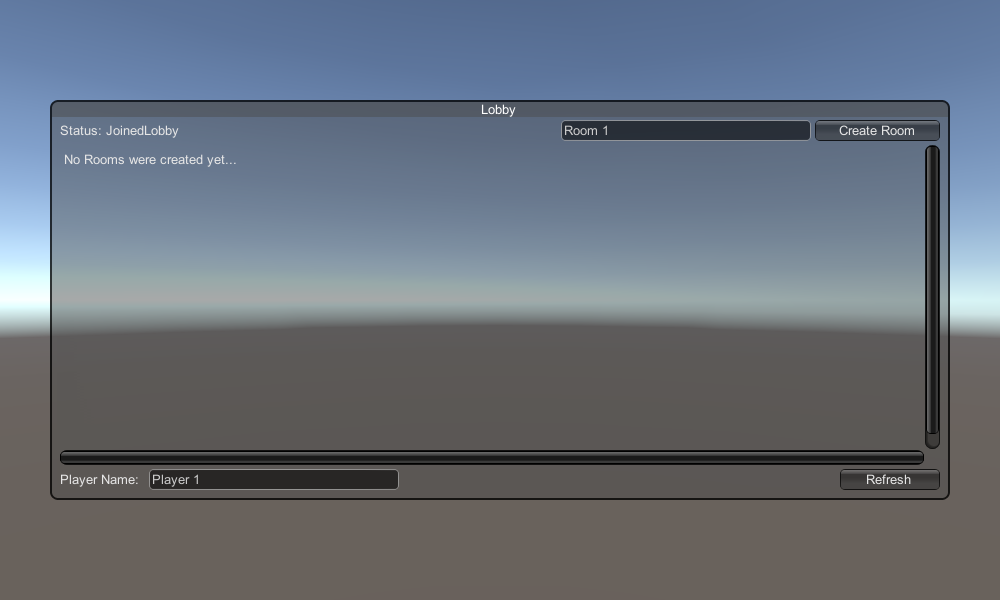 Låt oss börja med att skapa en lobbyscen som kommer att innehålla lobbylogik (bläddra i befintliga rum, skapa nya rum, etc.):