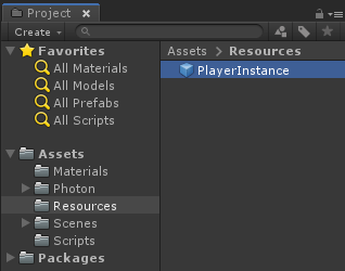 - Spara PlayerInstance till Prefab och flytta den till mappen som heter Resources (Om det inte finns någon sådan mapp, skapa en). Detta steg är nödvändigt för att kunna skapa flerspelarobjekt över nätverket.