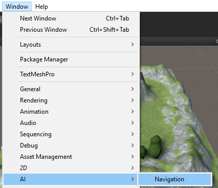 När du är i uppspelningsläge kommer du att märka att spelaren inte rör sig om du klickar på kartan. Det beror på att vi har en sista sak att göra, som är att baka ett navigeringsnät (Navmesh):