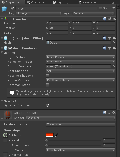 - Nästa är att skapa en målindikator prefab. Detta är bara ett enkelt GameObject med en Quad som kommer att indikera var vi har klickat på kartan.