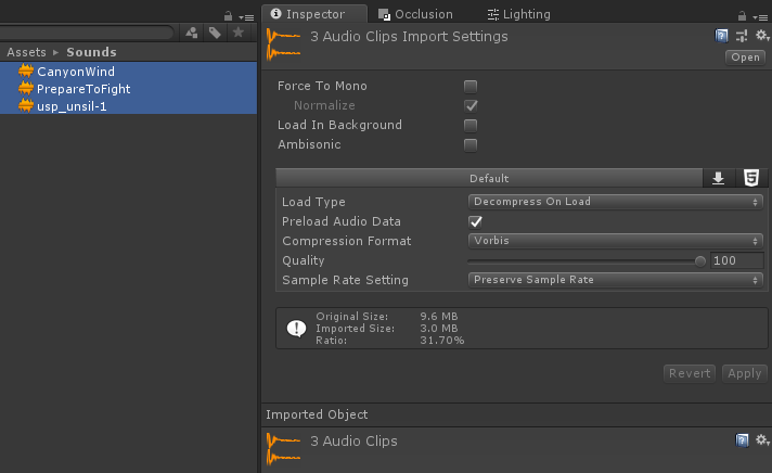 Till exempel, i mitt projekt har jag 3 ljud med olika syften, och som du kan se har alla importinställningar som inte är lämpliga för alla ljudtyper.
