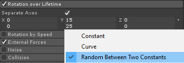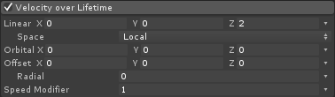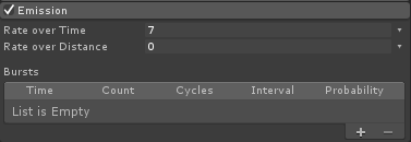- Aktivera dessa moduler i partikelsystemet: Emission, Form, Hastighet över livslängd, Färg över livslängd, Storlek över livstid , Rotation över livslängd, Externa krafter, Renderer.