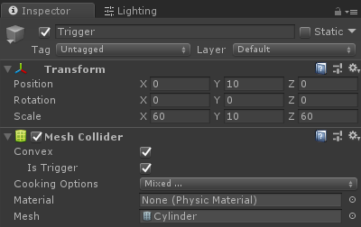 - Lägg till MeshCollider-komponenten till "Trigger" GameObject, markera kryssrutorna Convex och IsTrigger och ändra dess Mesh till standardcylinder