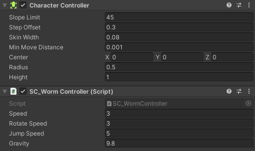 - Bifoga SC_WormController-skriptet till "Worm"-sfären (det kommer automatiskt att lägga till en annan komponent som heter CharacterController):